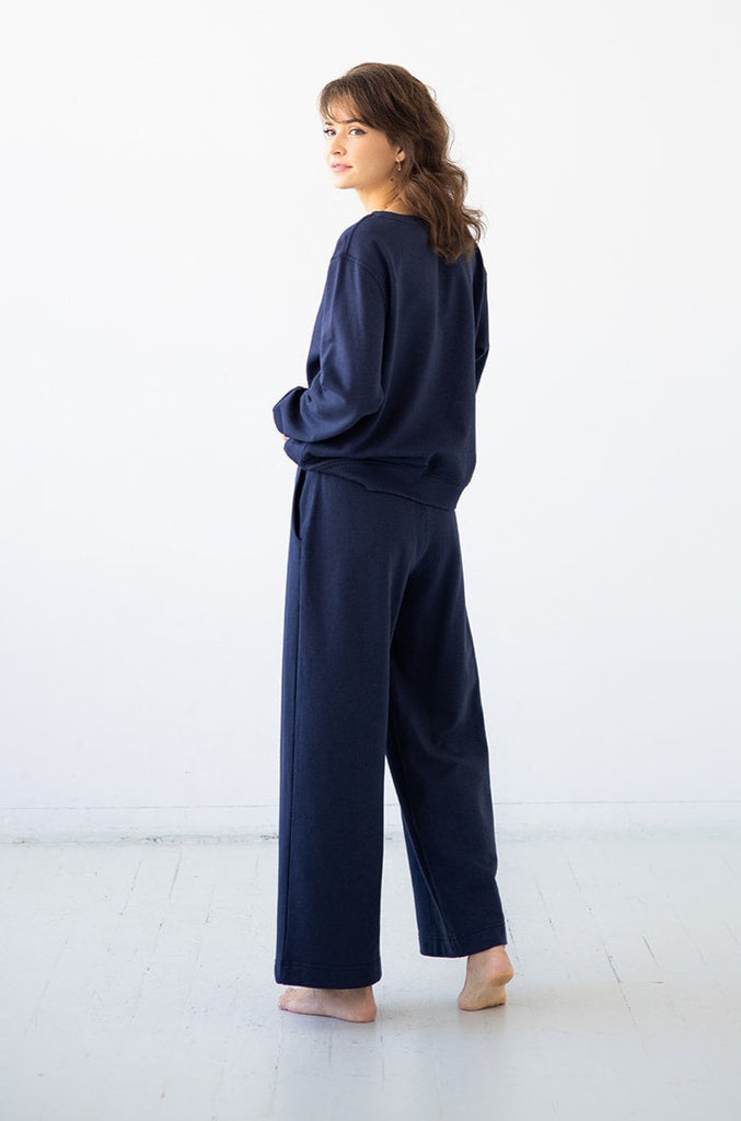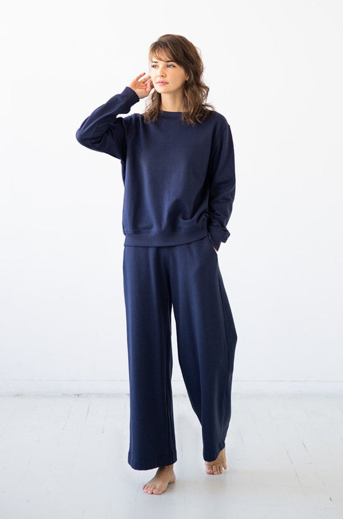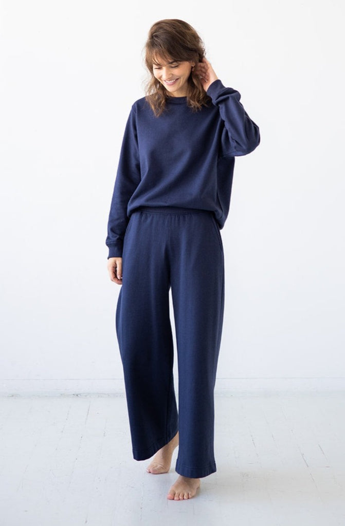 Our new wide leg sweatplants are fitted at the waist and taper out starting at the hip to ankle for a flattering modern silhouette. Perfect for cropped sweaters or fitted tops, these pants accentuate the legs and can be worn to lounge around the house or out to an afternoon brunch.