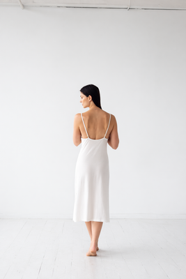 This ultra-soft, long, bias-cut nightgown is crafted from brushed Pima cotton, known for its luxurious texture and gentle touch against the skin. The gown features delicate spaghetti straps that provide a barely-there feel. Its bias cut allows it to gracefully skim the body's natural curves, adding a fluid, flattering silhouette that moves elegantly. The brushed finish on the Pima cotton gives it an extra layer of warmth and softness, making it perfect for cozy, restful nights.