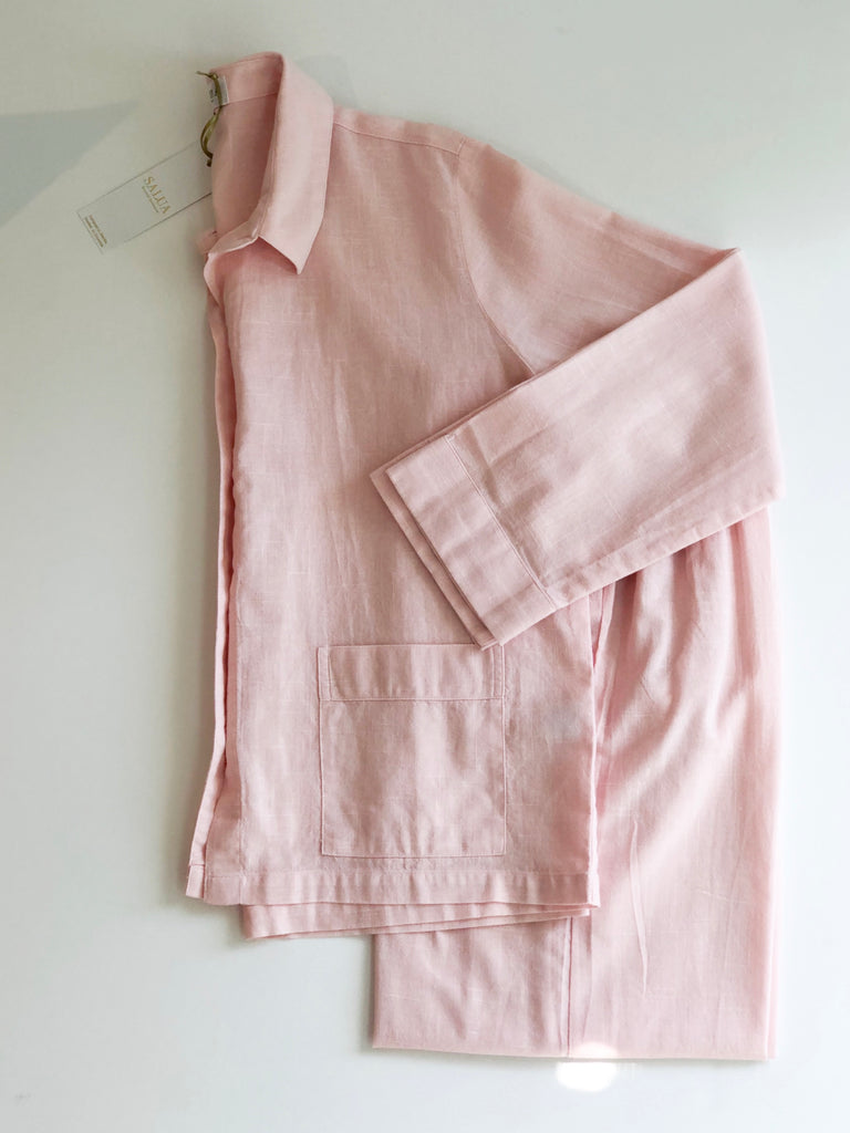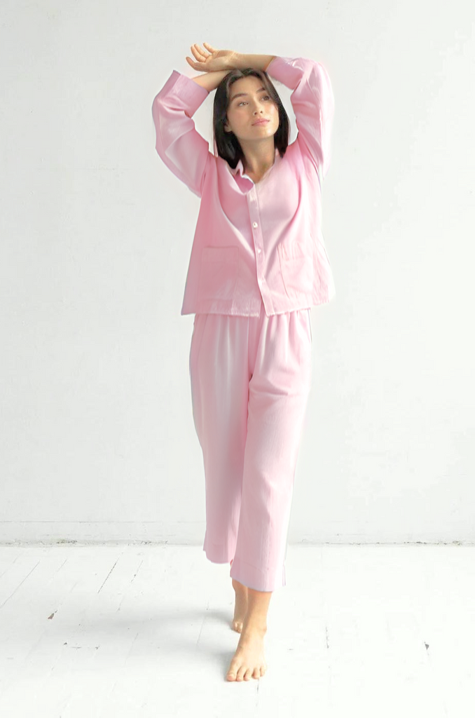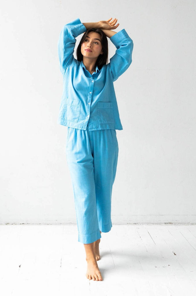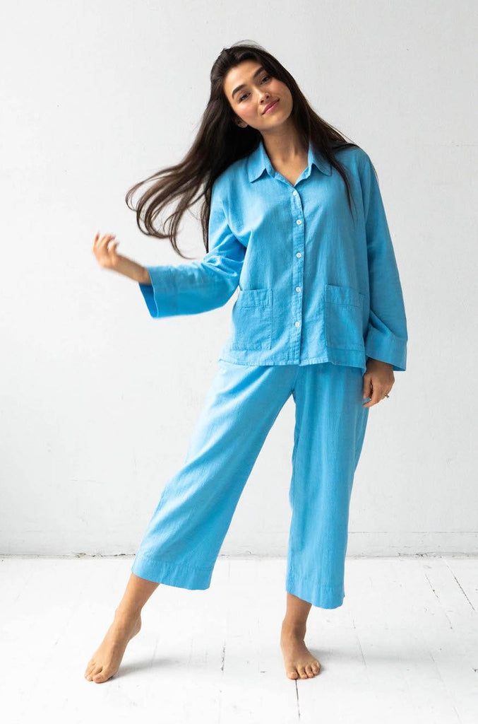 These pajamas are a fun new style! Made from our best selling Lino cotton, they have a linen look and feel, but are 100% cotton. The top is a button down notch collar style with patch pockets and the bottoms have an elastic waist and are ankle length. This elevated style is cool enough to be worn out and is the perfect weight for all year round.