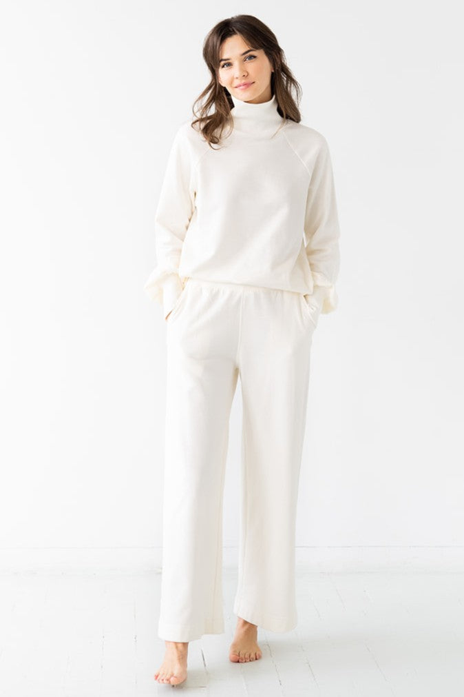 Our new wide leg sweatplants are fitted at the waist and taper out starting at the hip to ankle for a flattering modern silhouette. Perfect for cropped sweaters or fitted tops, these pants accentuate the legs and can be worn to lounge around the house or out to an afternoon brunch.