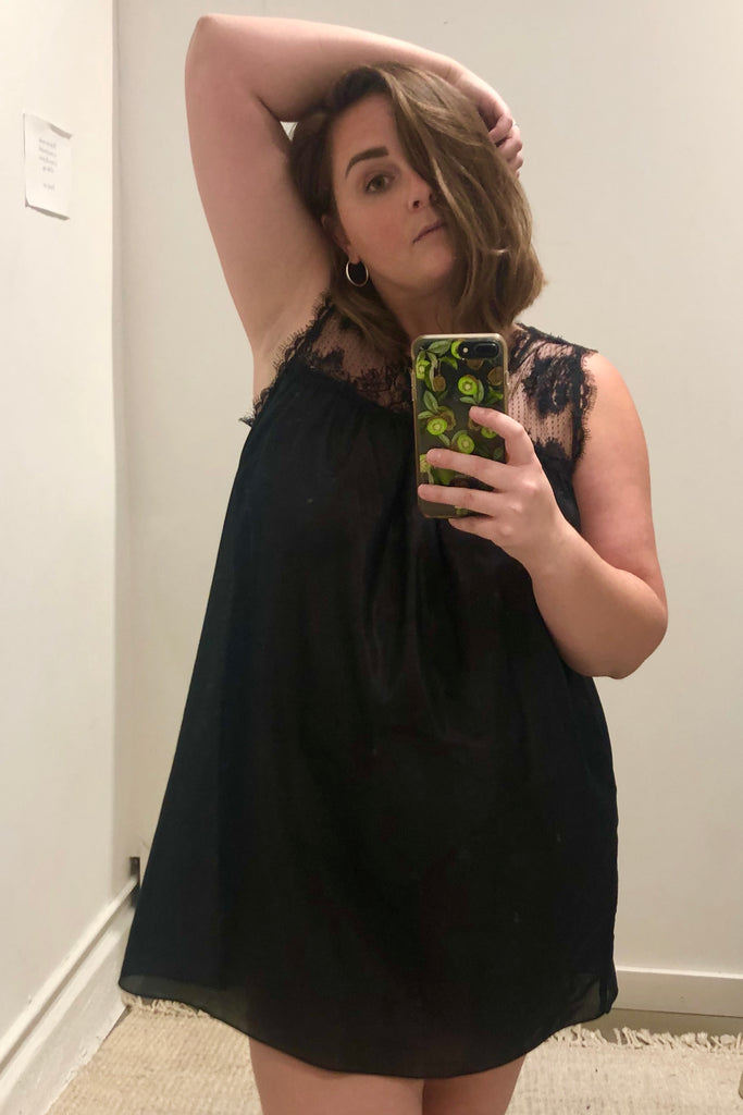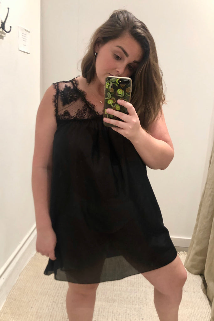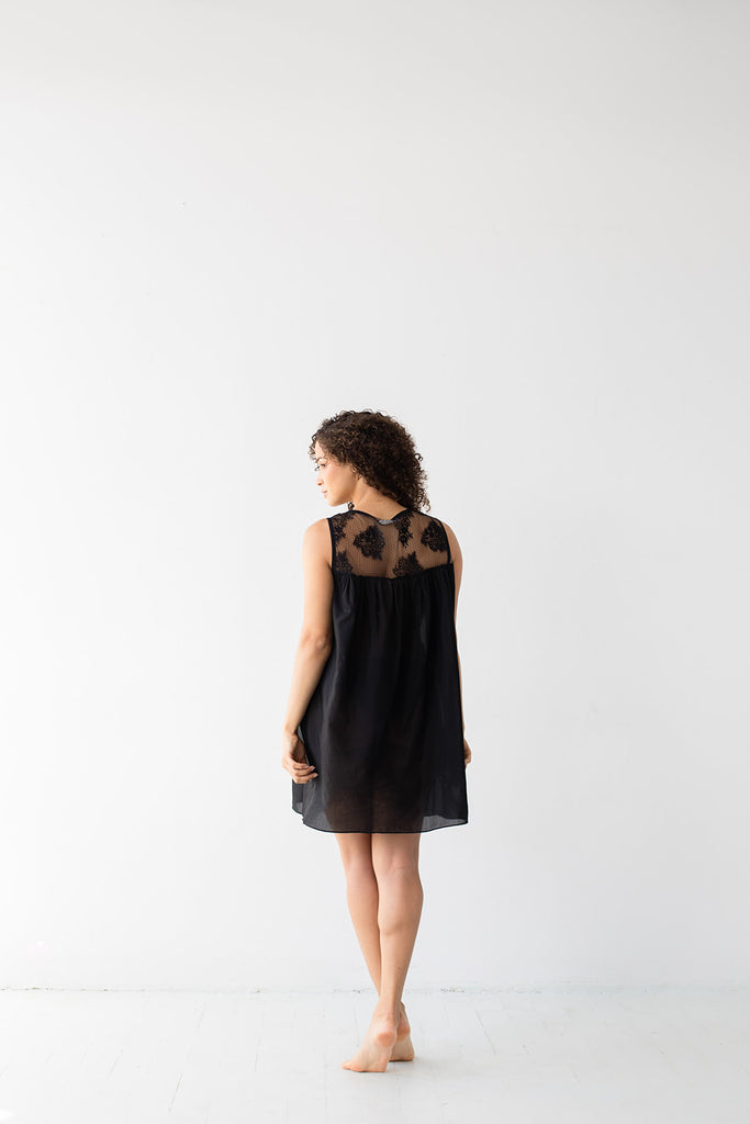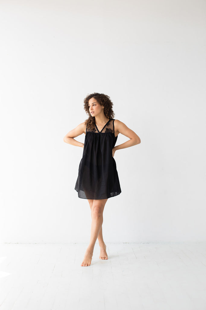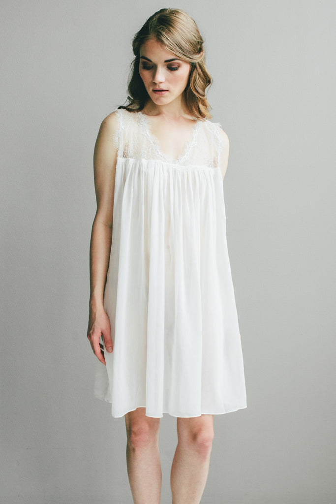 The Miel gown is one of our most elegant pieces. It has gorgeous Japanese lace at the top then our classic cotton/silk for the body of the gown. It is reminiscent of vintage nightgowns with a modern touch. It is 36" long.